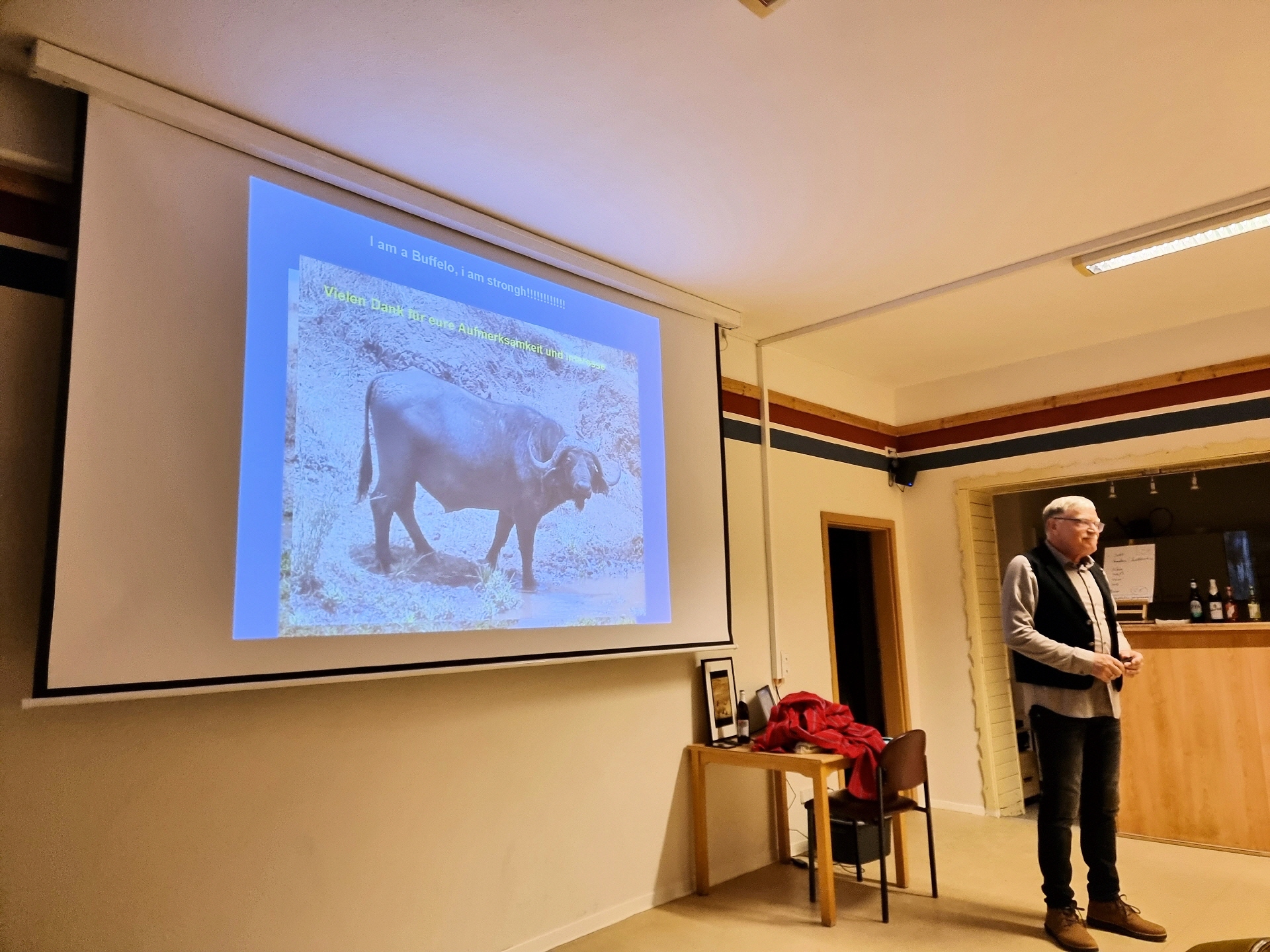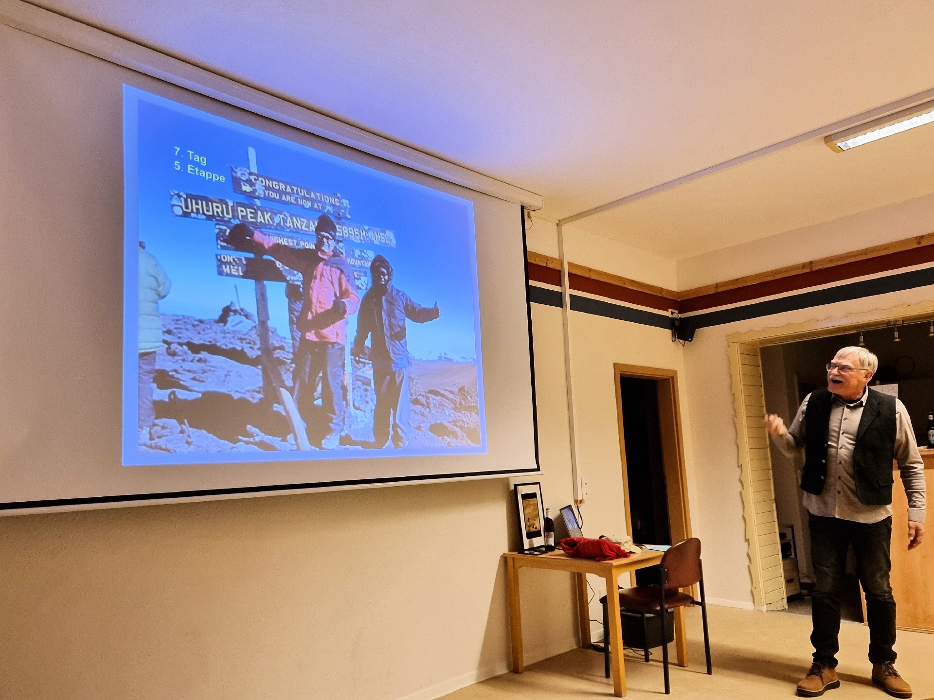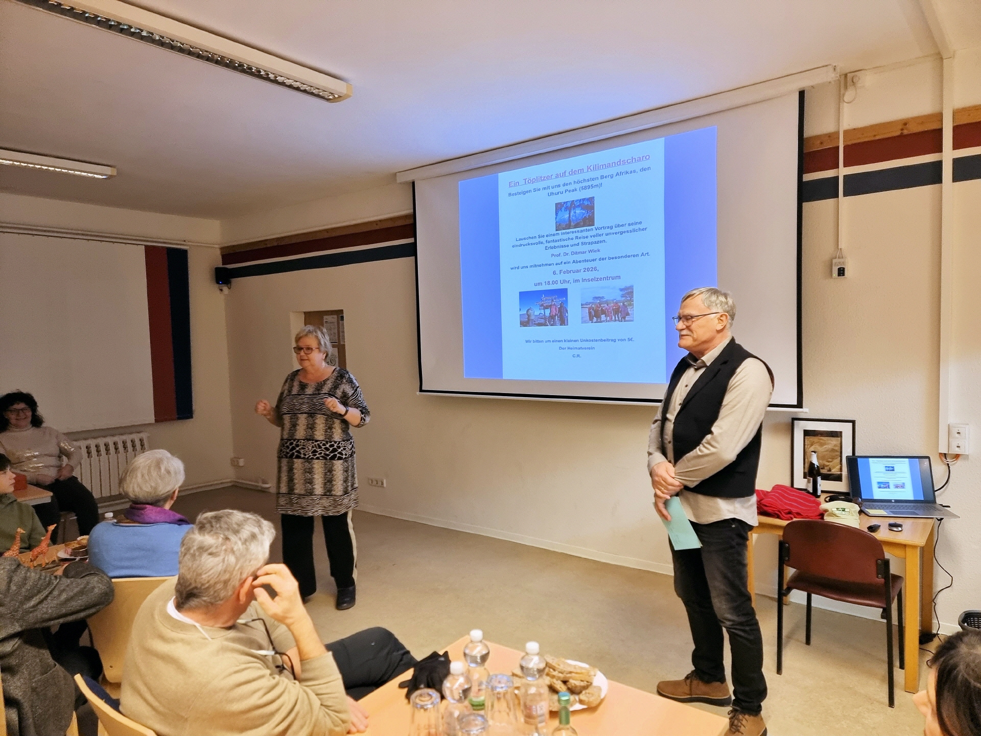 Im gut besuchten Inselzentrum lauschten etwa 50 Gäste einem faszinierenden Vortrag über eine eindrucksvolle Reise voller unvergesslicher Erlebnisse und Herausforderungen. Schon beim Eintreffen im Inselzentrum konnte man an der liebevoll gestalteten "afrikanischen" Tischdekoration erkennen, dass es ein unvergesslicher Abend werden würde.