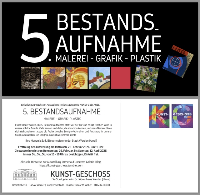 Die Bestandsaufnahme ist eine Leistungsschau der Ortsansässigen Künstlerinnen und Künstler aus dem Professionellen, Semiprofessionellen und Amateurbereich.