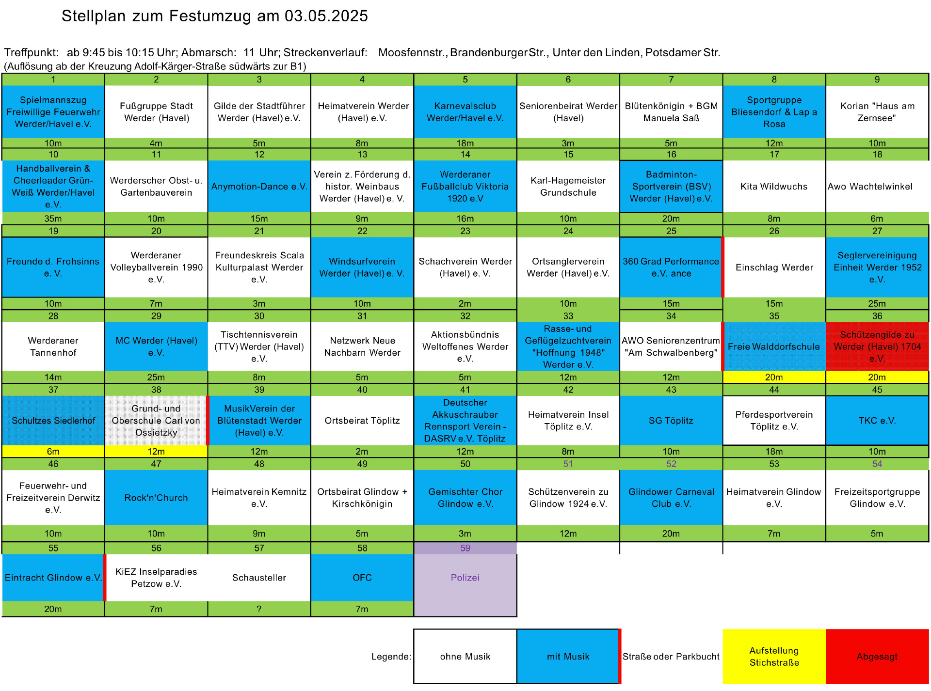 Es wird wieder einen Bustransfer mit einem Bus ab dem Dorfplatz geben. Die Abfahrt ist um 09.30 Uhr vorgesehen, sodass um 11.00 Uhr der Umzug ab Moosfennstraße beginnen kann. Für die Rückfahrt sind wir noch im Gespräch mit dem Organisationsteam, wo wir in Werder abfahren können (vermutlich Brandenburger Straße), da der Festbereich großräumig für den Fahrzeugverkehr gesperrt ist.