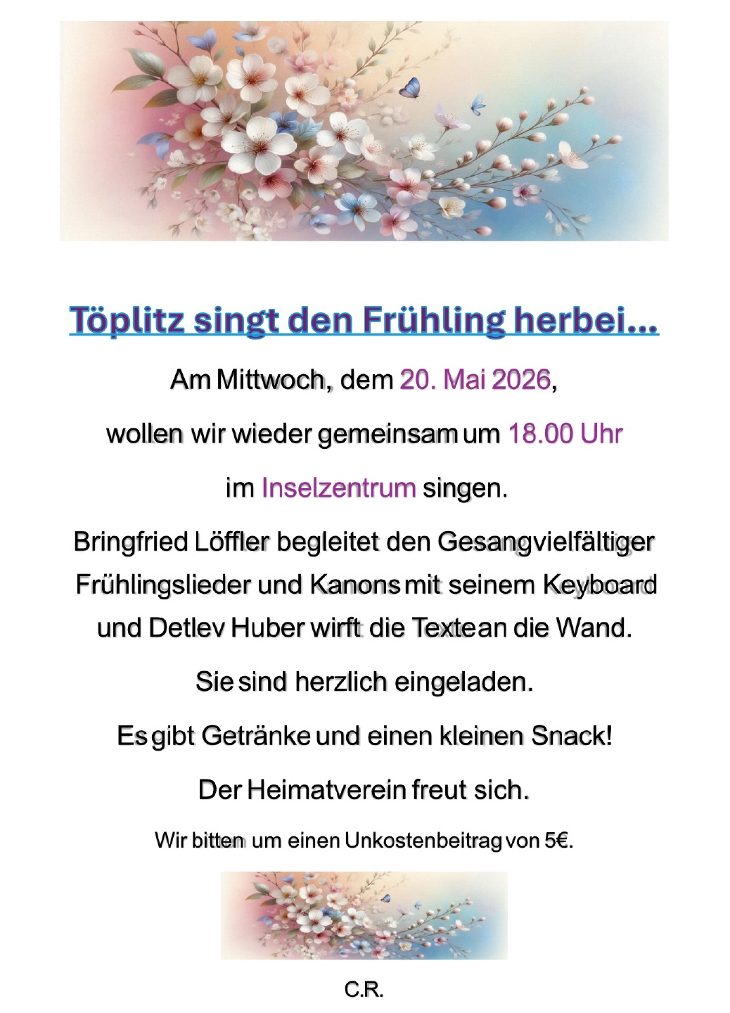 20.05.2026: Töplitz singt Volkslieder, Teil 2, Inselzentrum, 18 Uhr [mehr]