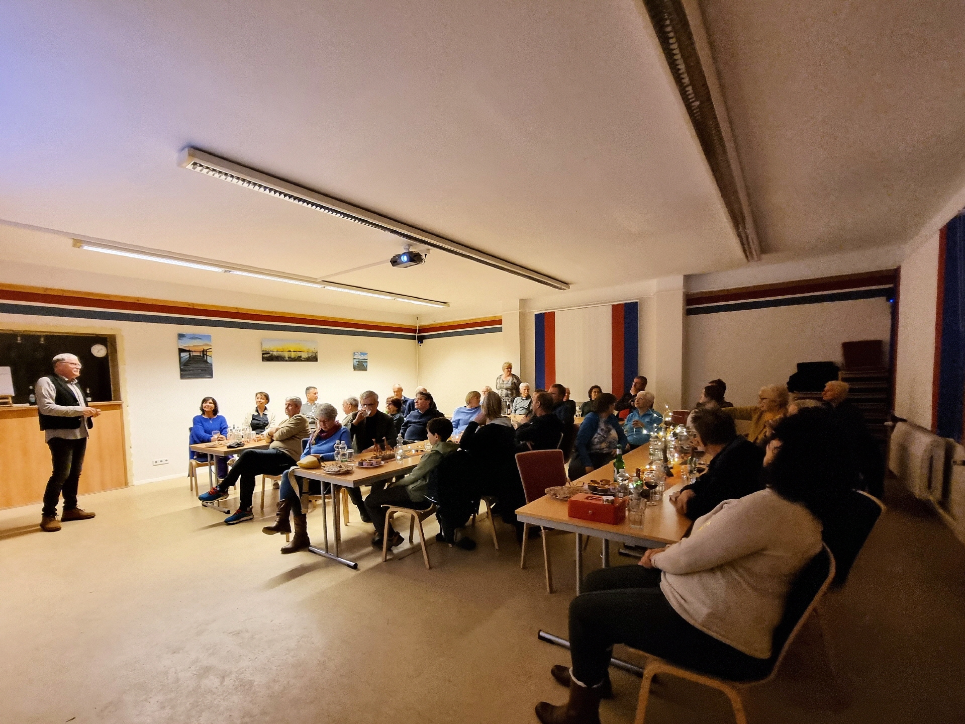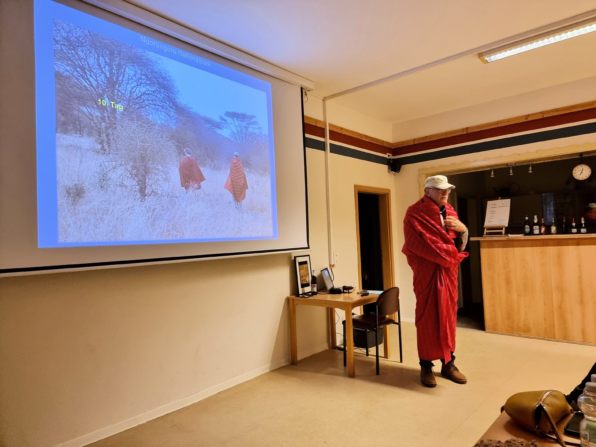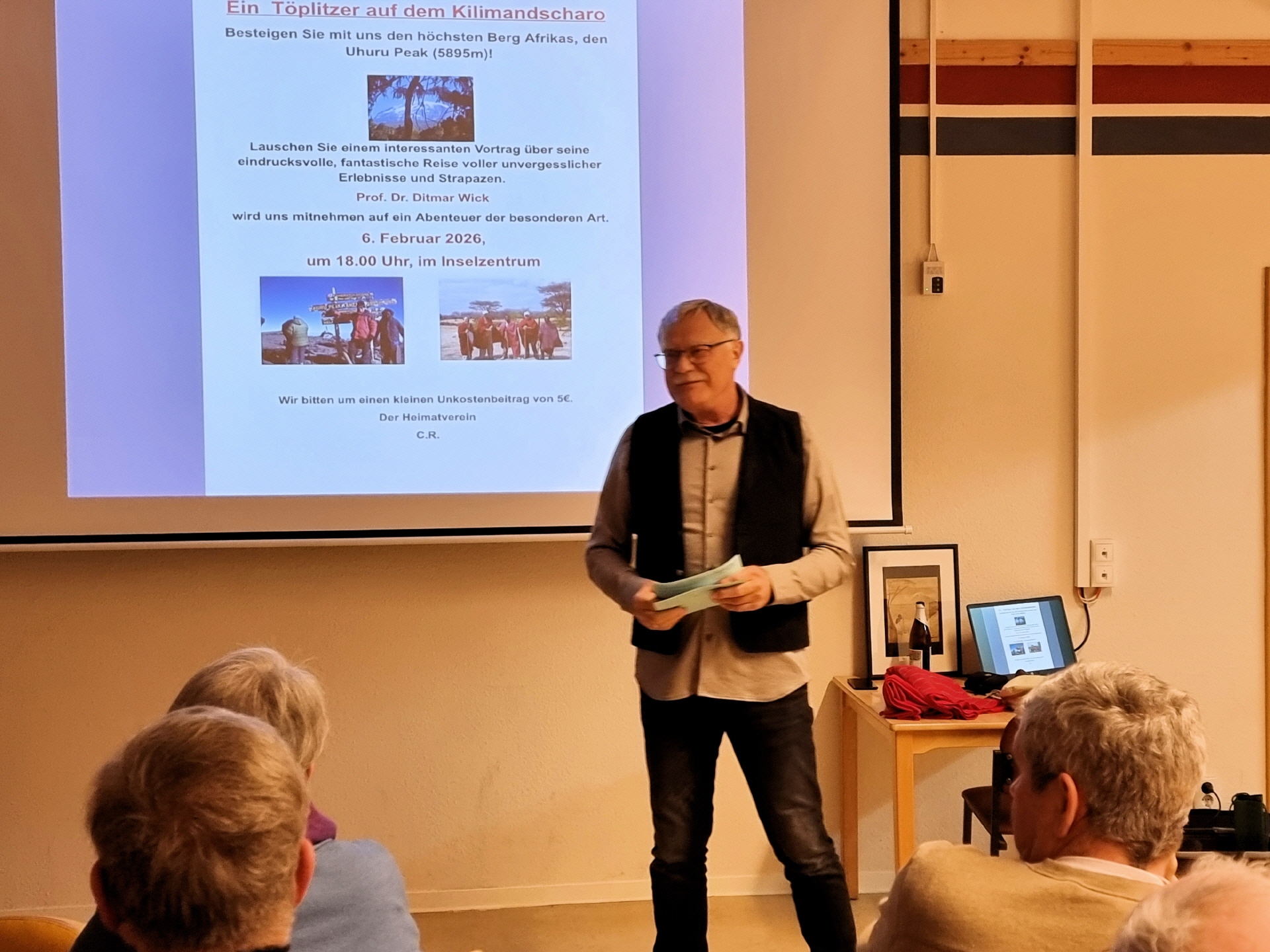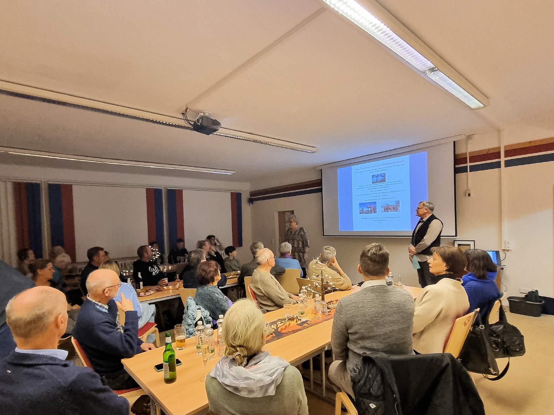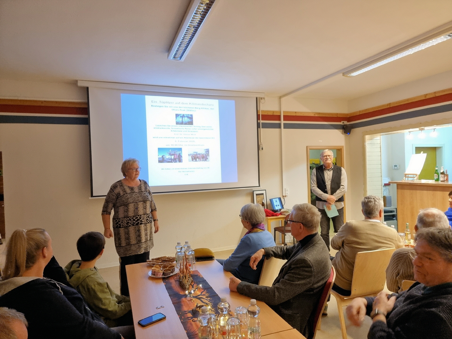 Im gut besuchten Inselzentrum lauschten etwa 50 Gäste einem faszinierenden Vortrag über eine eindrucksvolle Reise voller unvergesslicher Erlebnisse und Herausforderungen. Schon beim Eintreffen im Inselzentrum konnte man an der liebevoll gestalteten "afrikanischen" Tischdekoration erkennen, dass es ein unvergesslicher Abend werden würde.