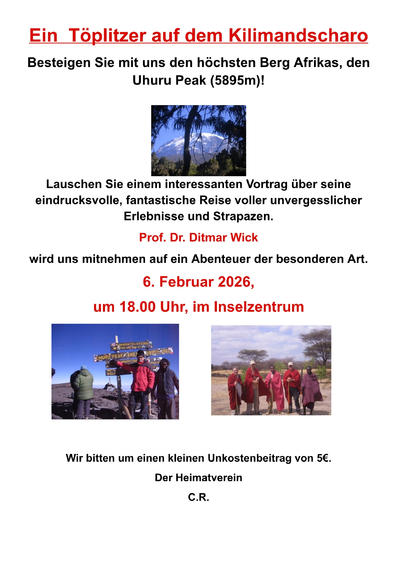 Am 6. Februar 2026 nahm uns Prof. Dr. Ditmar Wick aus Töplitz auf ein besonderes Abenteuer mit: die Besteigung des höchsten Berges Afrikas, dem Uhuru Peak (5895m), besser bekannt als Kilimandscharo.