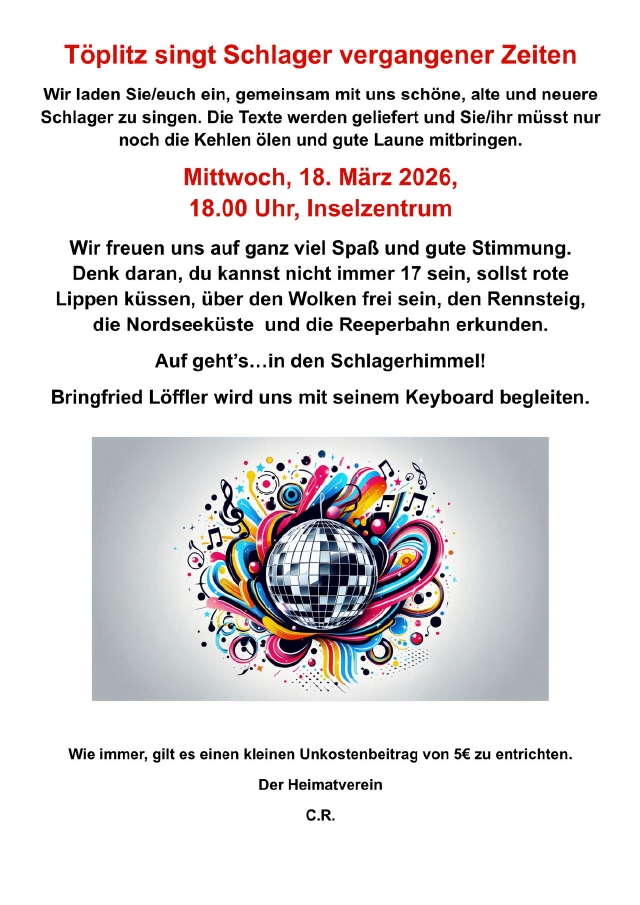 Am Mittwoch, dem 3. Dezember 2025, um 18.00 Uhr, lud der Heimatverein Töplitz zum gemeinsamen Singen von Weihnachtsliedern ins Inselzentrum ein.